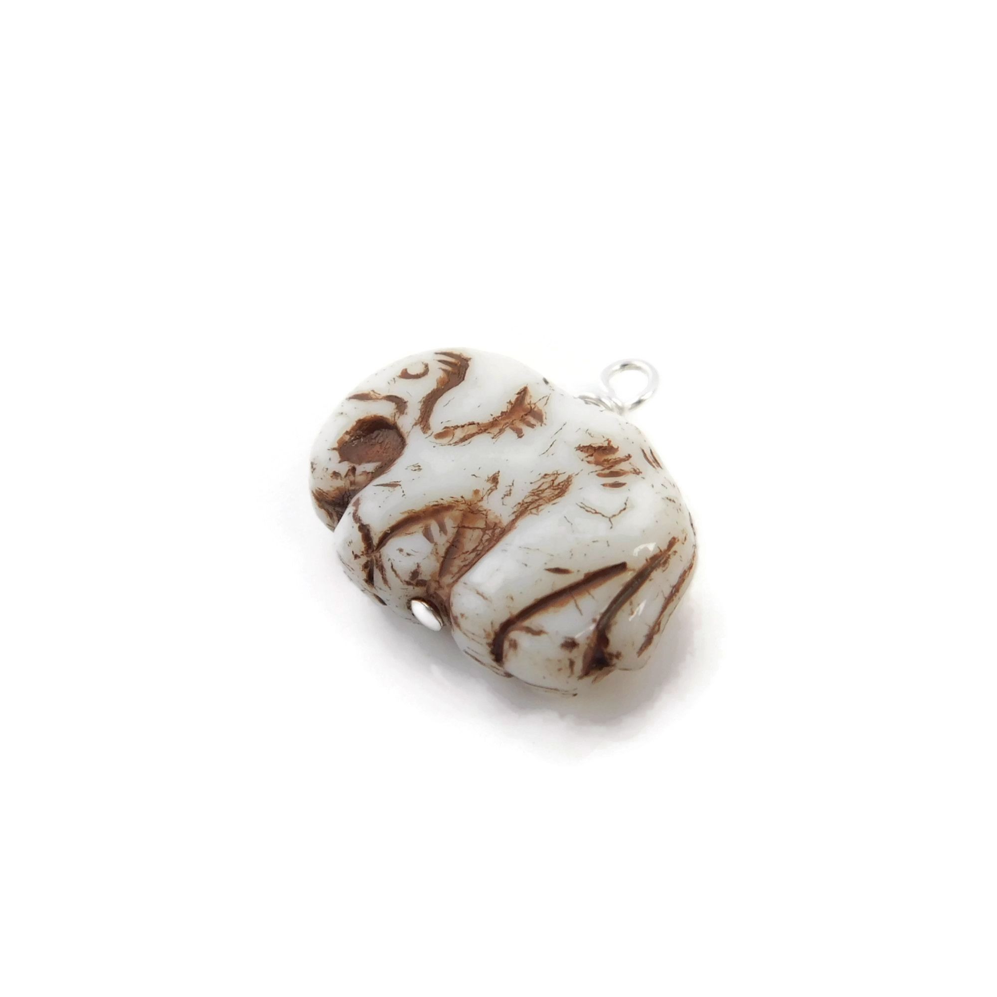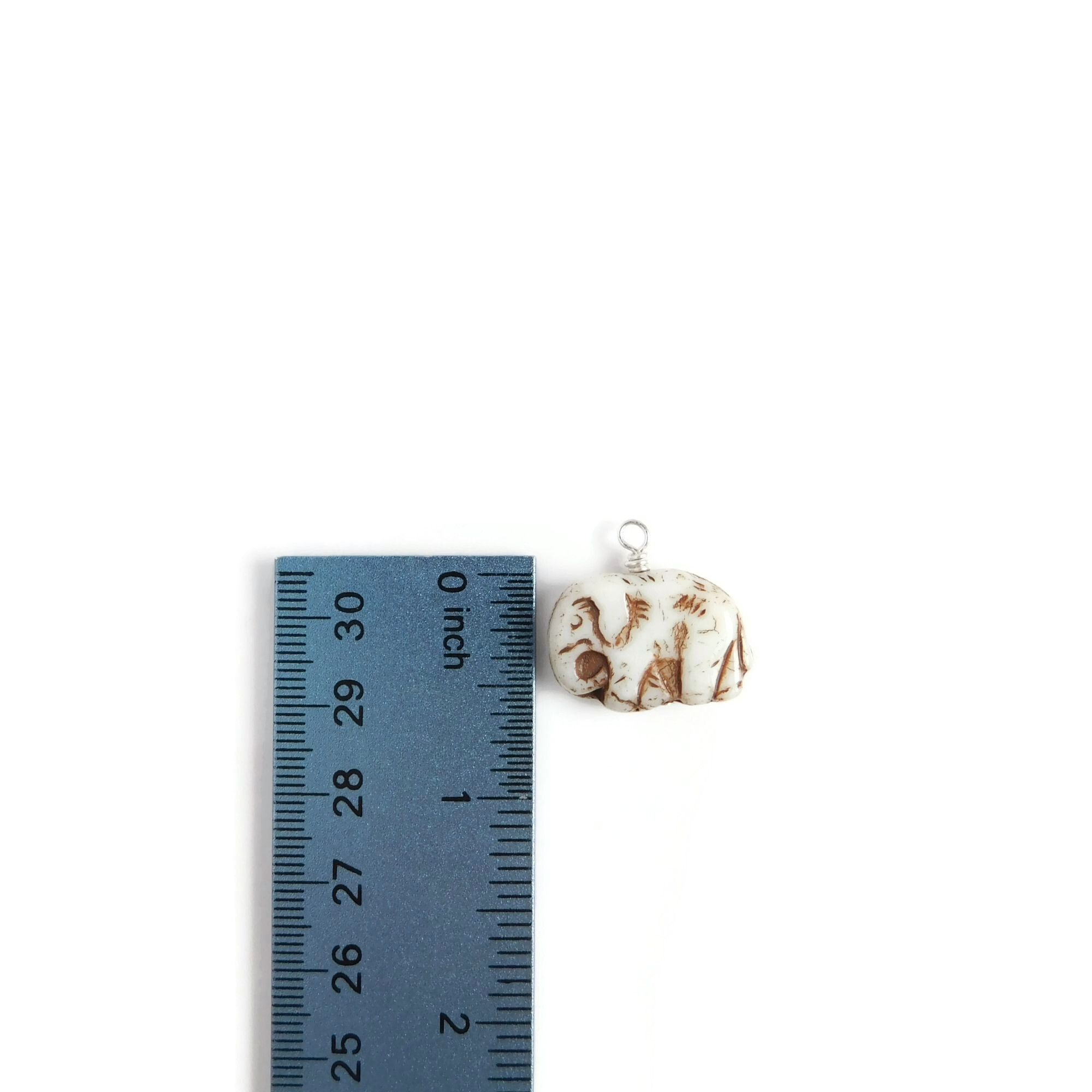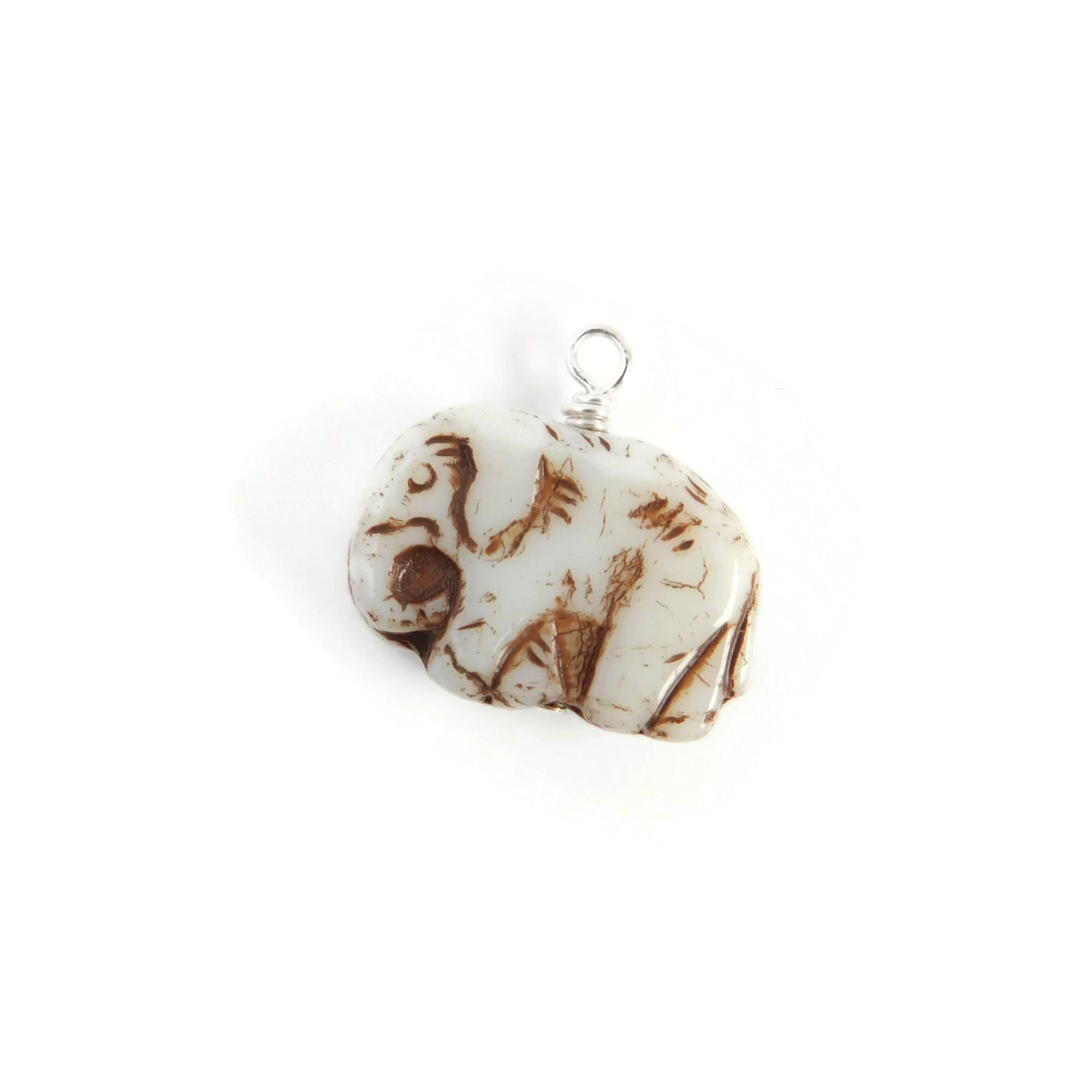 This elephant charm pendant is handmade with a Czech glass bead. The elephant bead, decorated by hand, is white with brown accents. It is double-sided and inspired by vintage pressed glass beads.