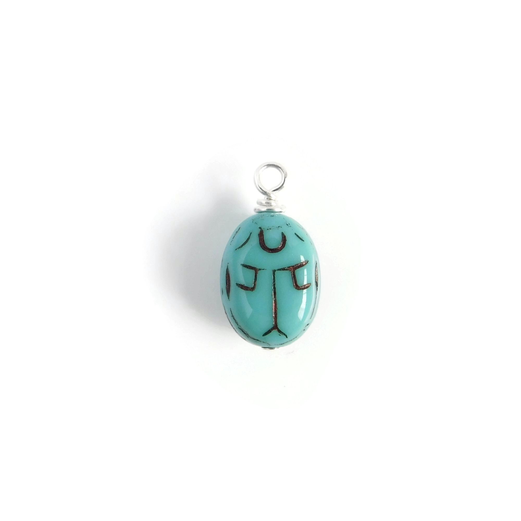 This scarab charm is handmade with a Czech glass bead. The scarab, decorated by hand, is blue with bronze colored accents. It is double-sided and inspired by vintage pressed glass beads.