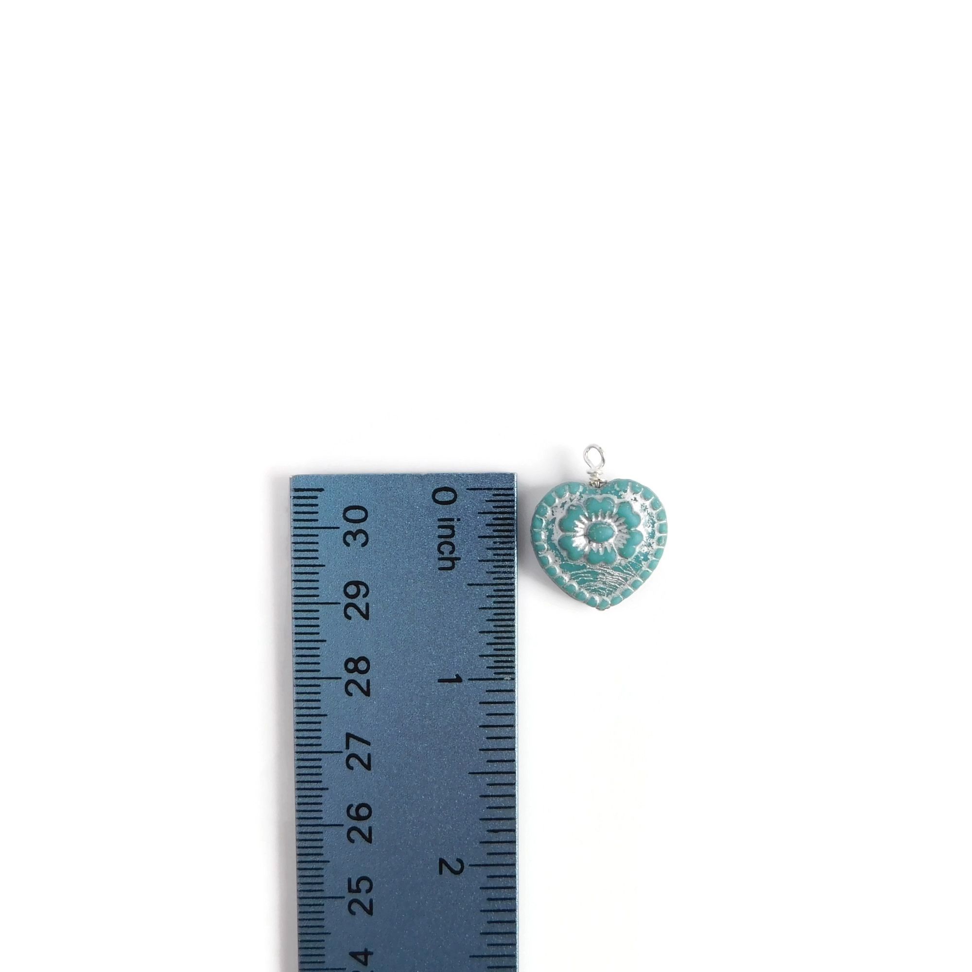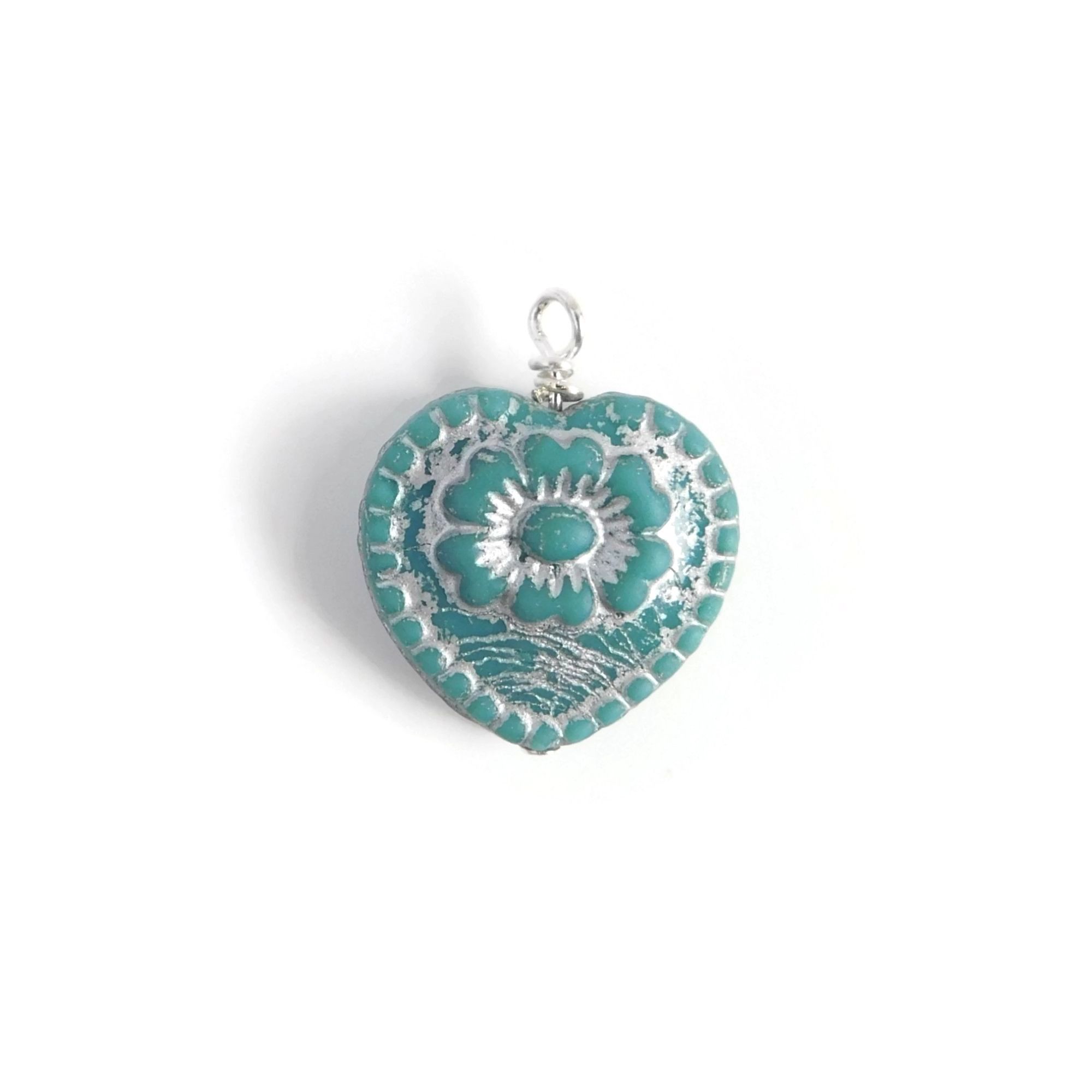 This glass heart pendant is made with a Czech pressed glass bead. The light blue heart is imprinted on both sides with a pretty flower and decorated with a dotted edging with a silver wash. Skilled bead makers made these beads in small batches using antique molds.