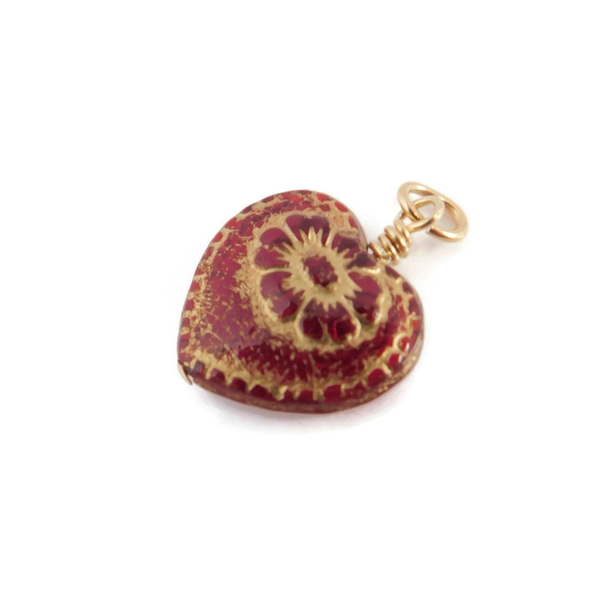 This glass heart pendant is made with a Czech pressed glass bead. The translucent red heart with a gold wash is imprinted on both sides with a pretty flower and a dotted edging. Skilled bead makers made these beads in small batches using antique molds.