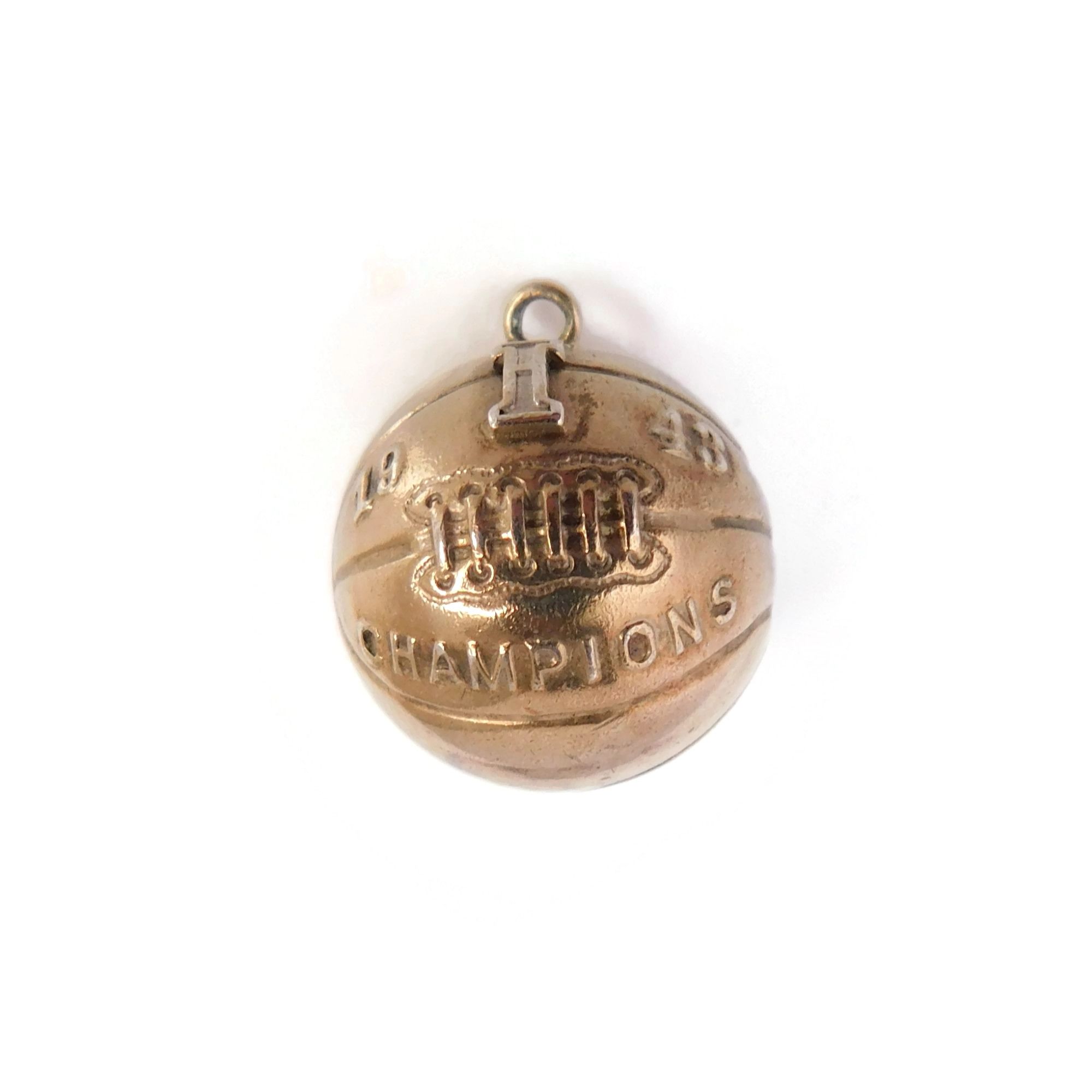 This is a vintage basketball charm. The charm says “1943 CHAMPIONS” and has an initial of either an “I” or an “H.” It is made out of gold-tone metal.