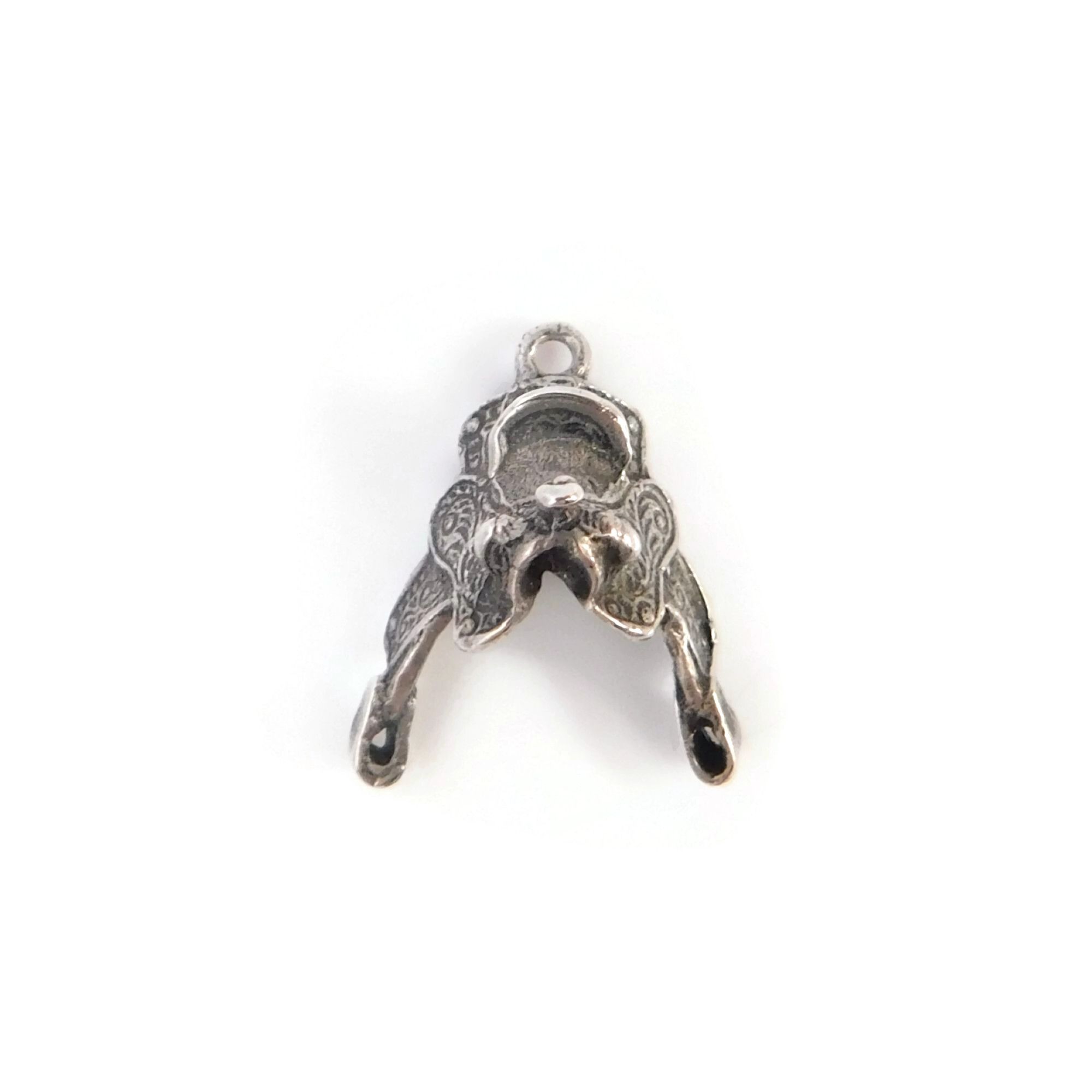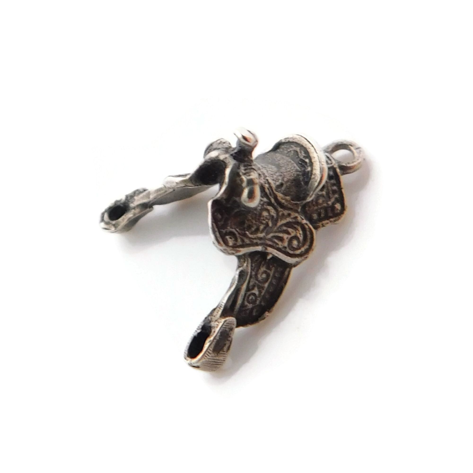 This is a vintage charm of a saddle. The western saddle has fancy swirls along the sides. The 3D charm is detailed on both sides. It is not marked sterling but tests positive for silver.