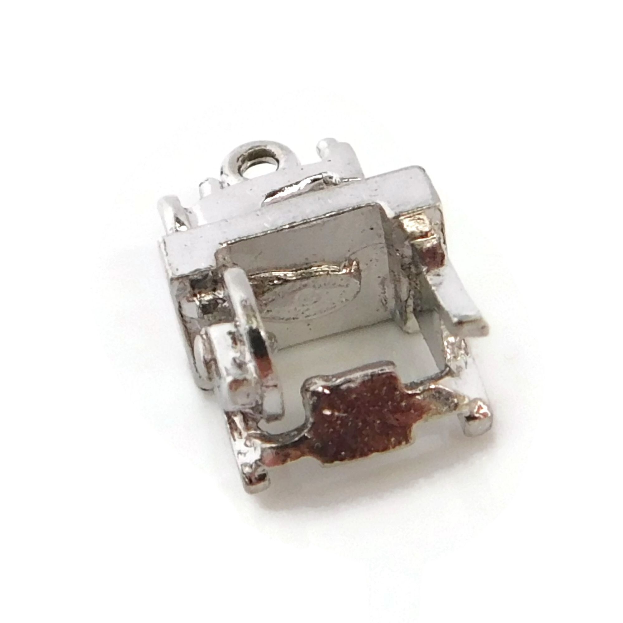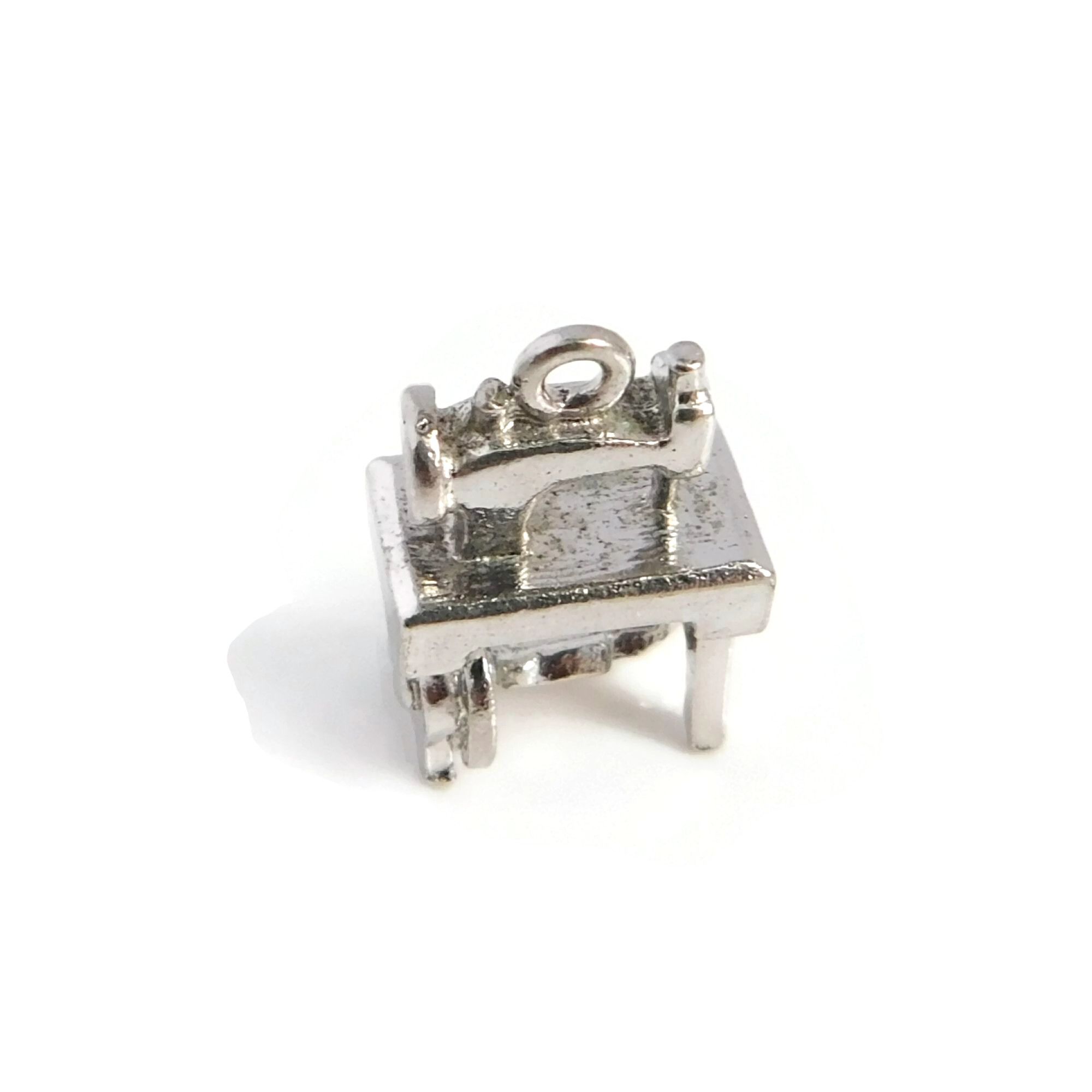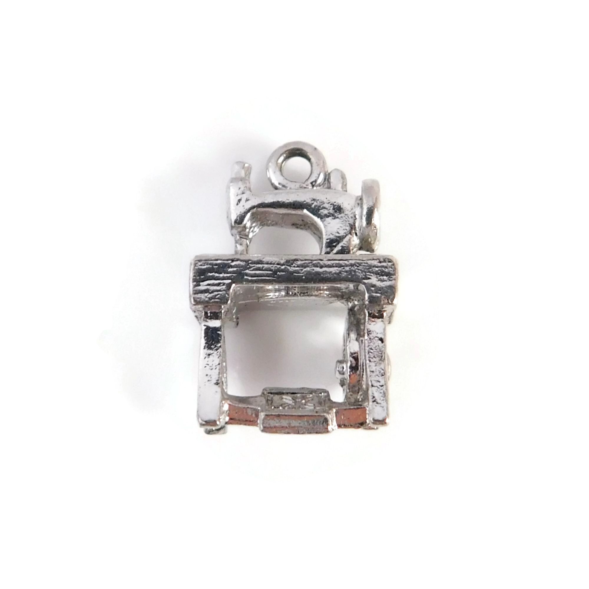 This is a vintage sewing machine charm. The charm depicts an antique sewing machine with its table. It is signed “DANECRAFT STERLING” with a maker’s mark on the bottom (but this is worn and hard to read). It is rhodium-plated sterling silver.