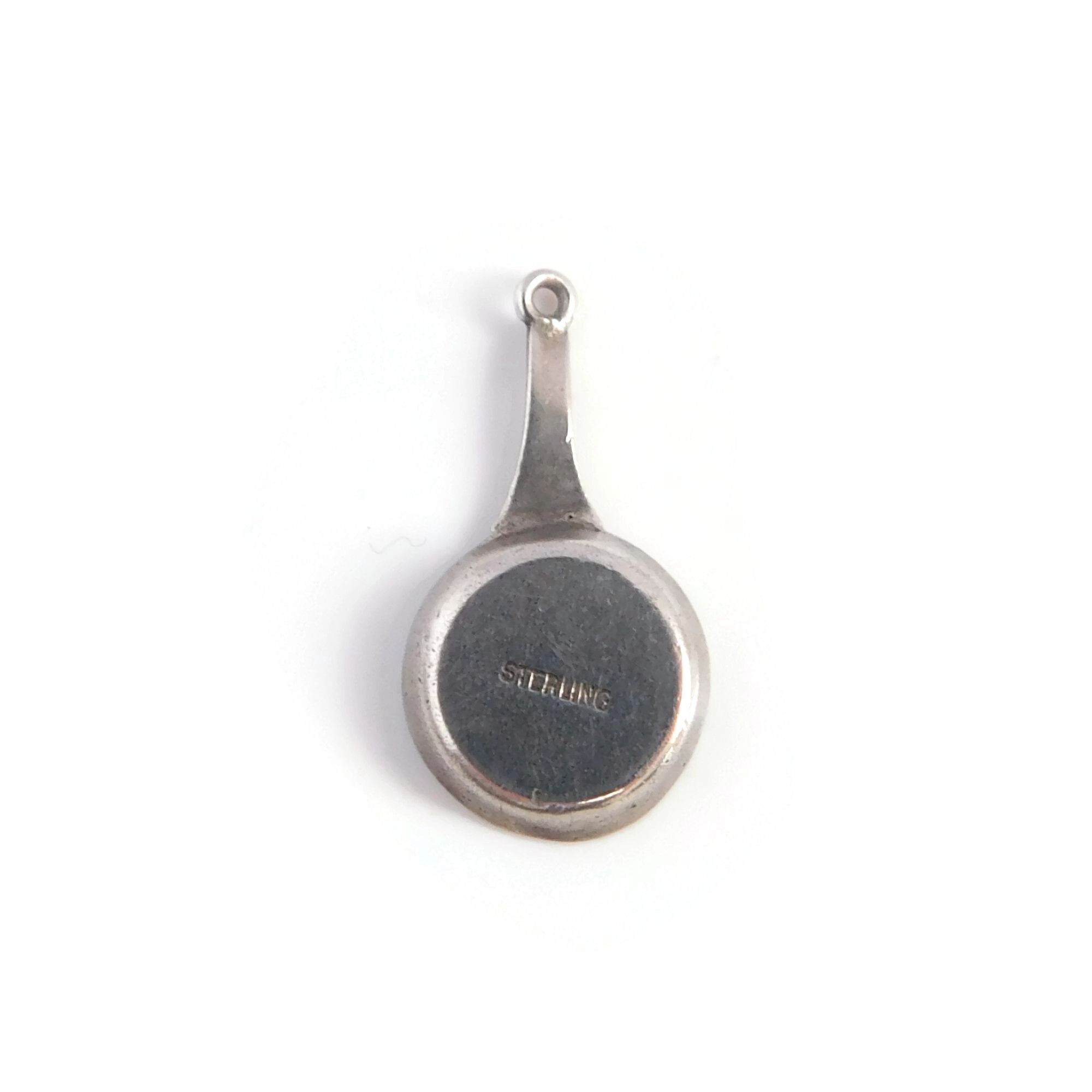 This is a vintage silver charm of two hot dogs in a frying pan. The 3D frying pan has two hot dogs in the middle surrounded by the words “HOT DOG”. The charm is marked “STERLING” on the back.