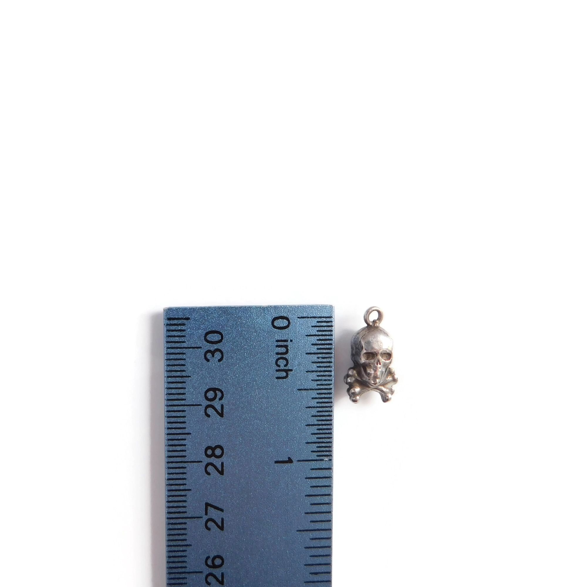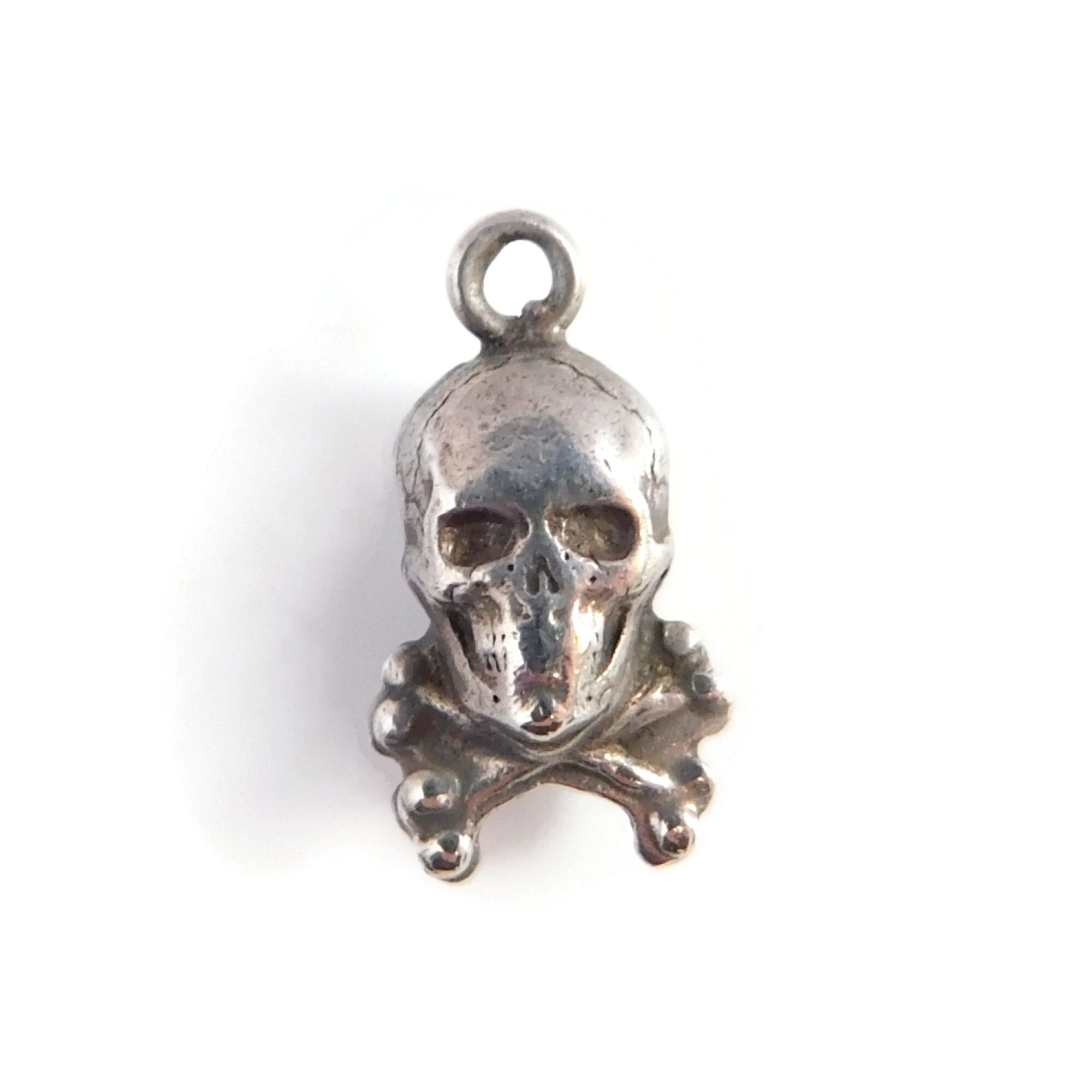 This is a vintage silver charm of a skull and crossbones. The charm shows the skull’s face on both sides. The unmarked charm has tested positive for silver.