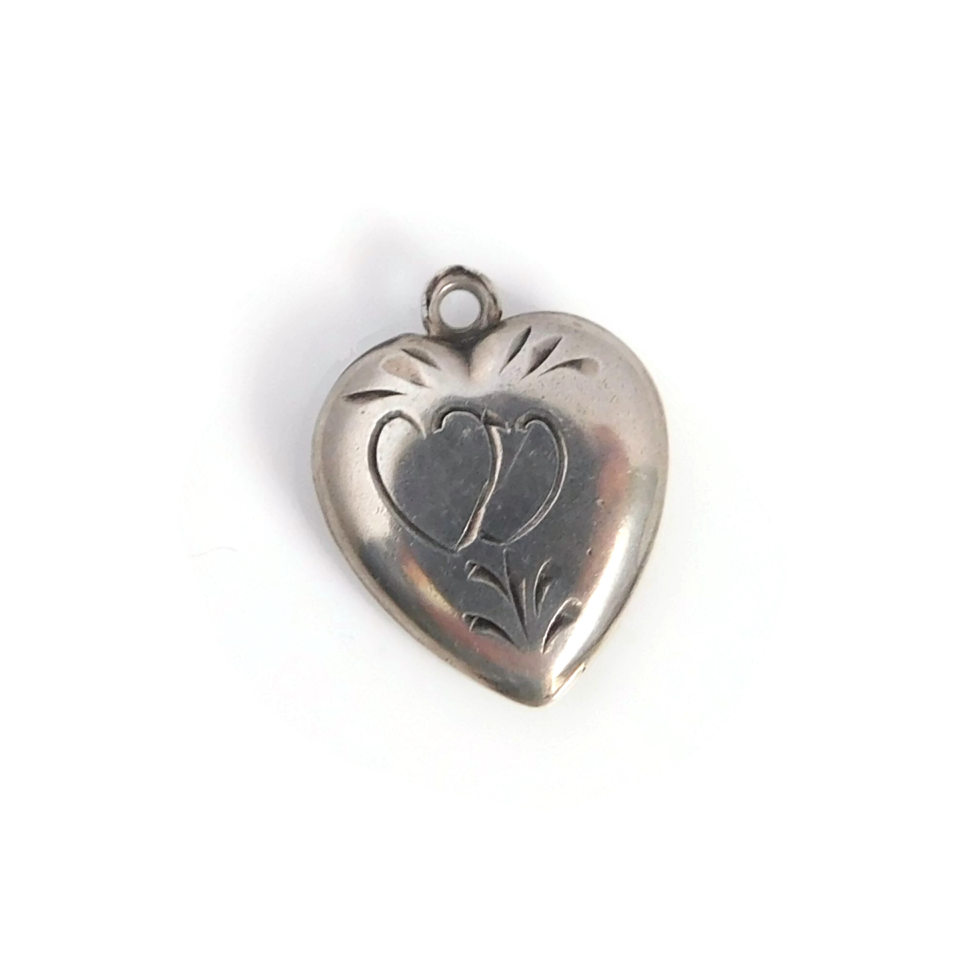 This vintage puffy heart charm has a hand etched design. The heart has two hearts with decorative lines around them. On the back, it is signed “SALLY” and marked “STERLING.” The sweet charm is perfect for a bracelet or necklace.