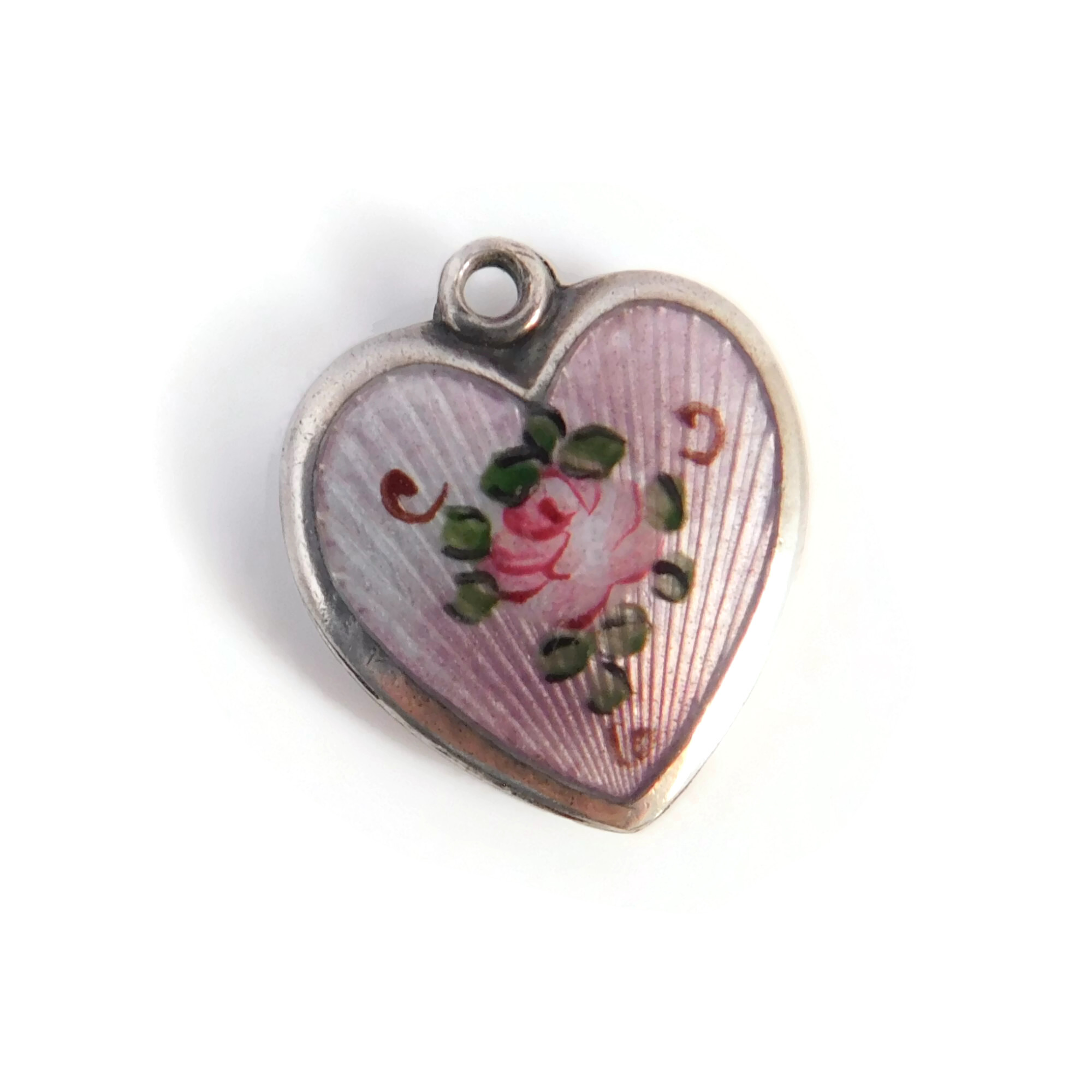 This vintage sterling silver puffy heart charm has a light pink enamel design. The heart features a hand-painted pink rose with green leaves and brown curlicues. Made by the Walter Lampl jewelry company, the charm is signed “STERLING” and has a WL in a shield. The charm is engraved with the name “JACK.”
