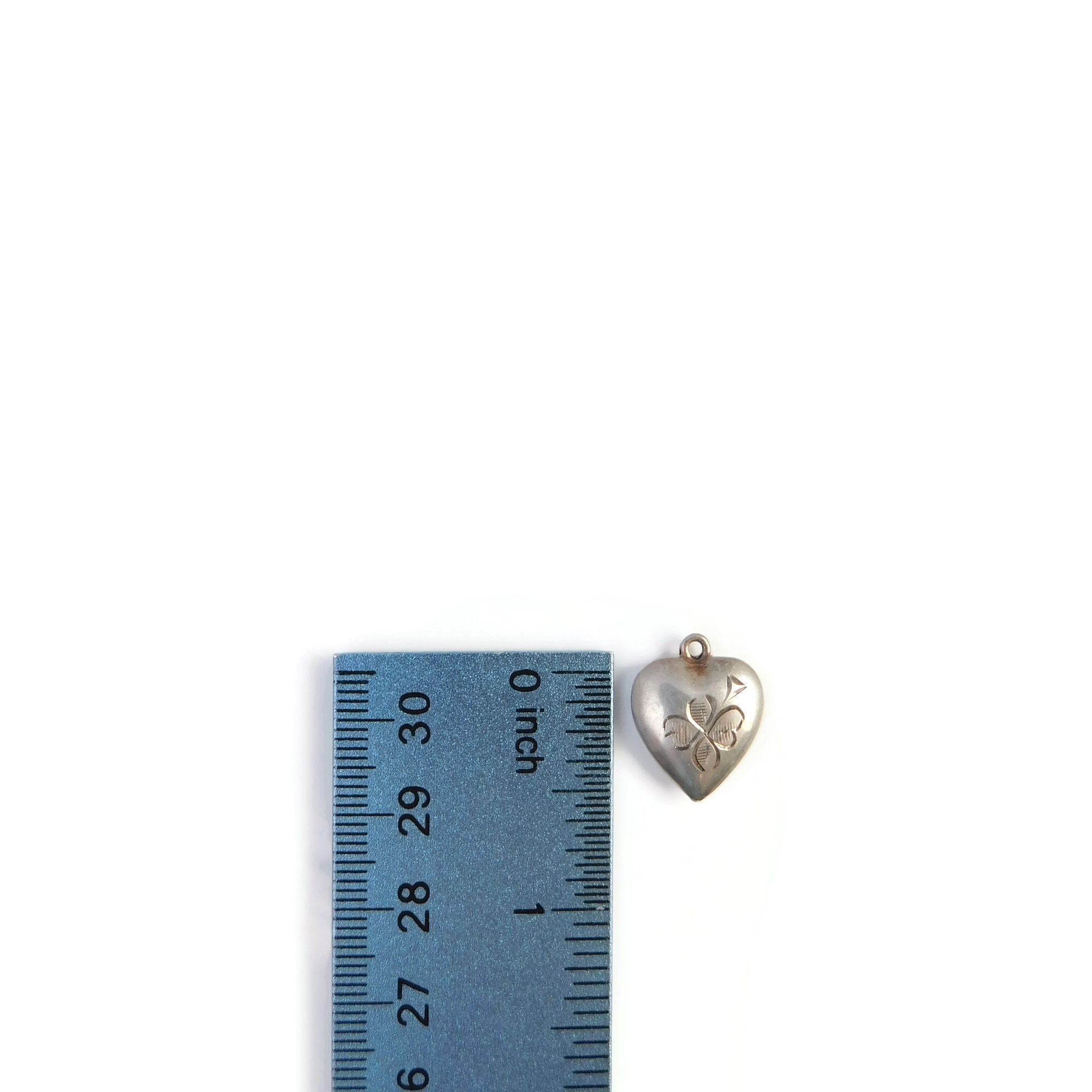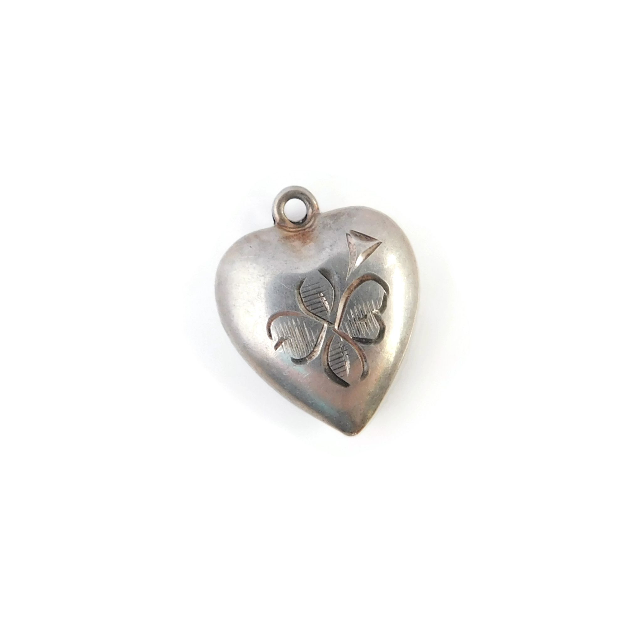 This vintage sterling silver puffy heart charm has an etched design of a four leaf clover. It is signed “STERLING” on the back.