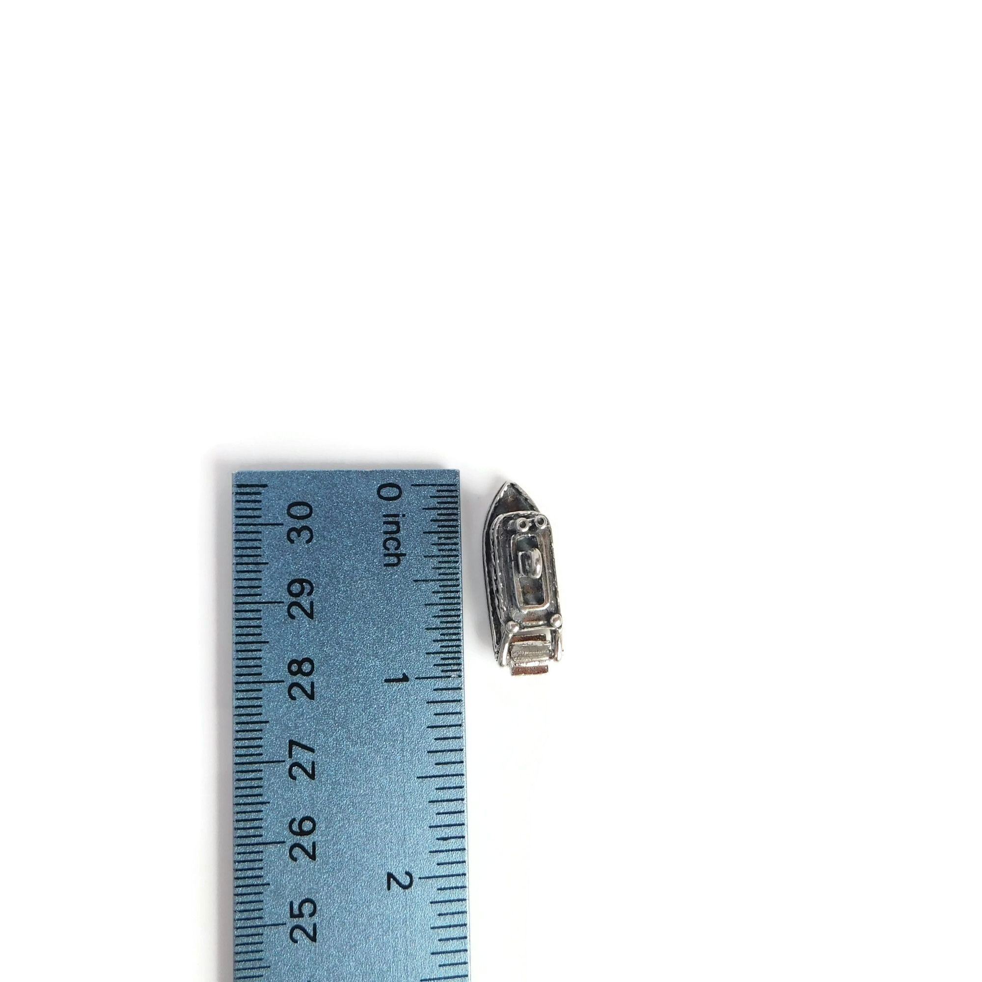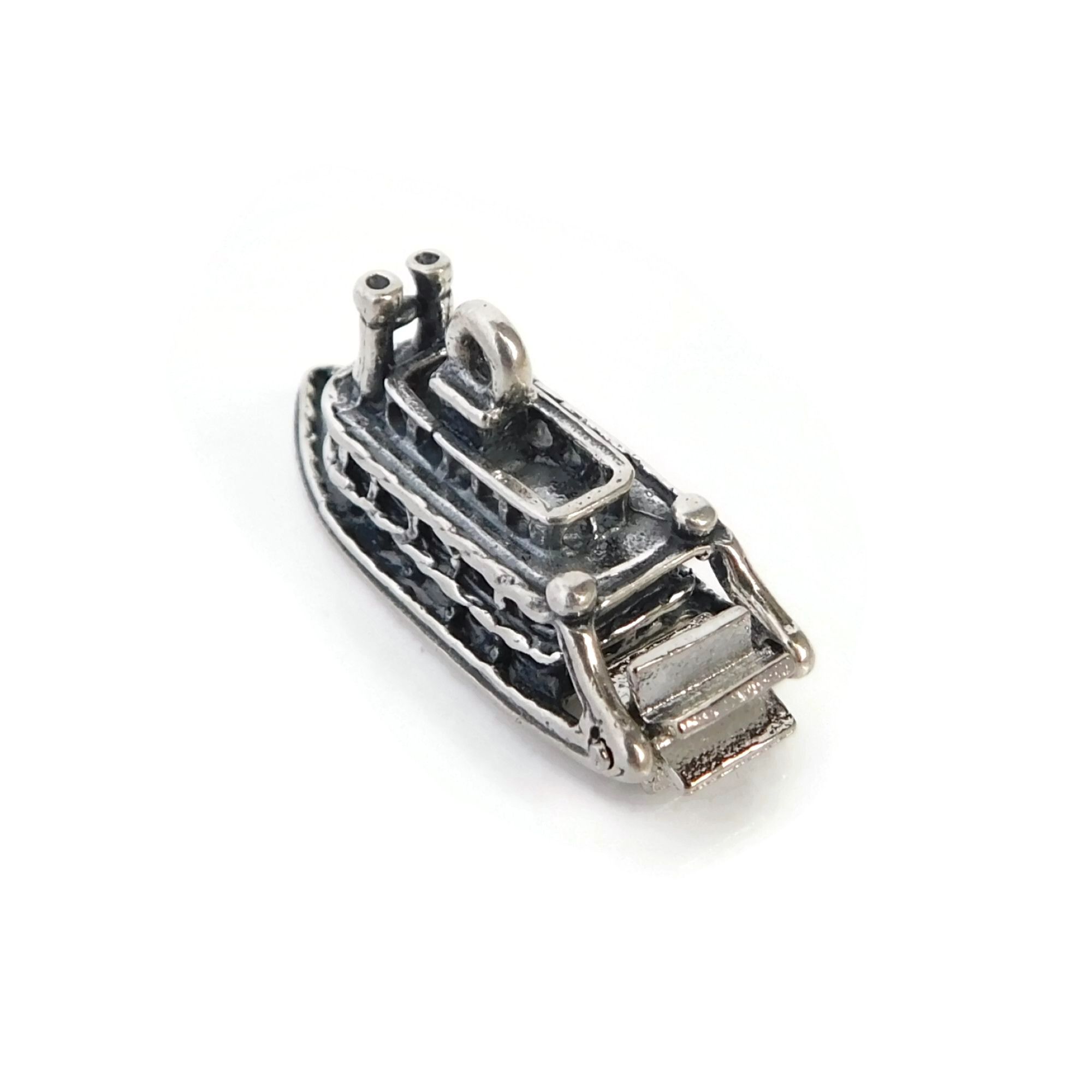 This is a vintage sterling silver charm of a steamboat. The boat has a movable paddle wheel and two smokestacks. The charm is signed “BEAUCRAFT © STER” on the bottom.