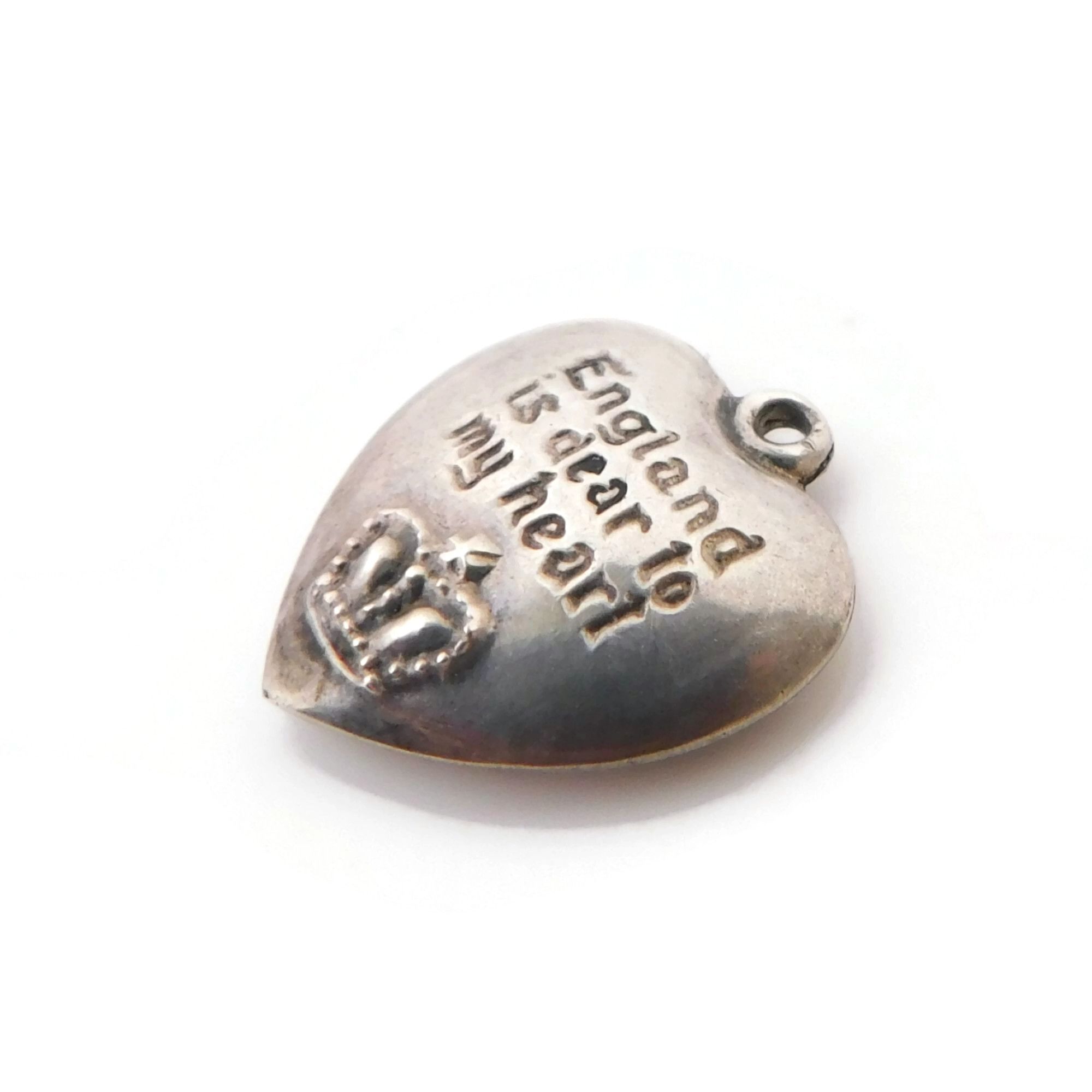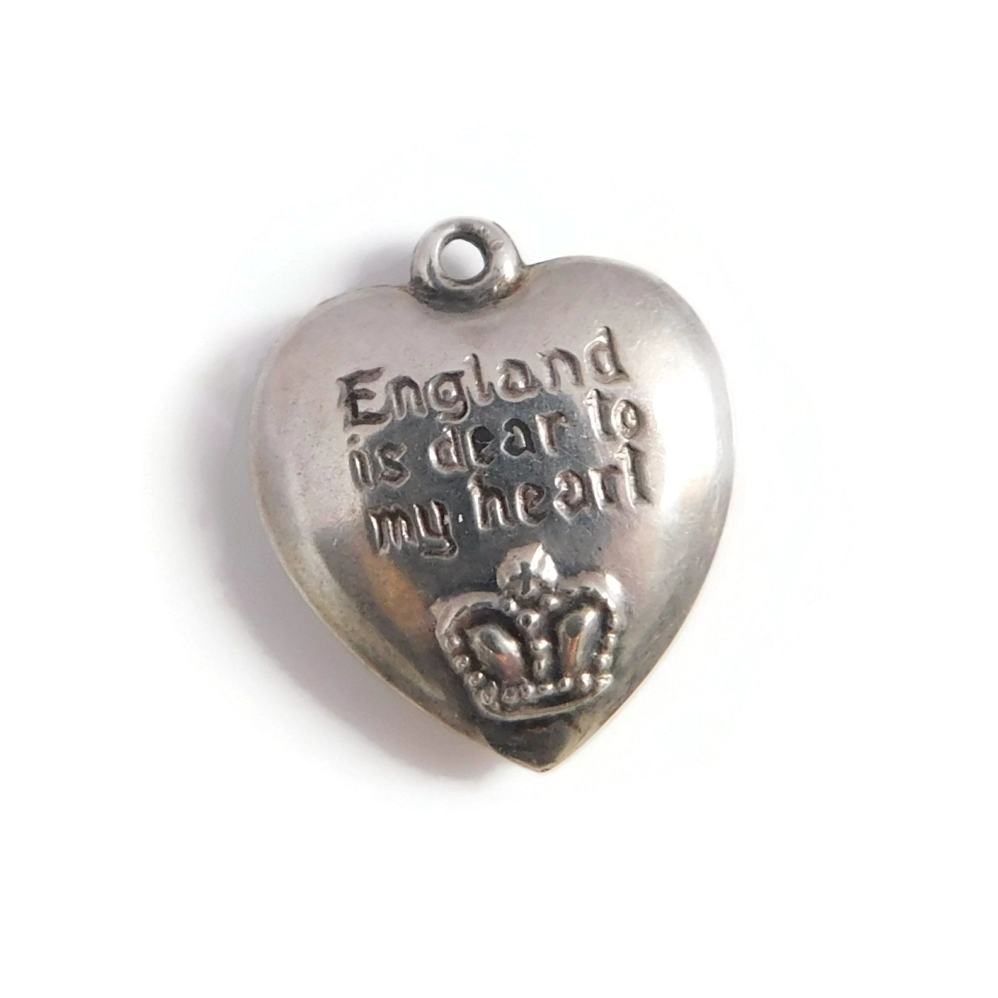 This is a vintage Walter Lampl heart charm. The puffy heart is inscribed “England is dear to my heart” above a crown. On the back, the charm is signed “BUNDLES FOR BRITAIN” and has the Walter Lampl maker’s mark of a W and L inside a shield. The charm has tested positive for silver. This charm is part of the jewelry line that the Walter Lampl company created during World War 2 for the Bundles for Britain charity, which raised funds and sent goods to aid the British people.